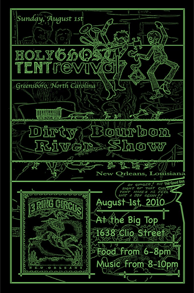 It’s going up at the Big Top (1638 Clio St.), 6pm tonight (Sunday August 1st) – we’ll begin with a 5 course meal, then at 8pm Dirty Bourbon will take the stage (our last show of the summer) followed by our North Carolinian friends Holy Ghost Tent Revival at 9pm.