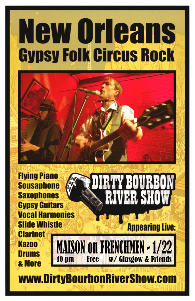 This Saturday, January 22nd at La Maison de Music on Frenchmen St (508) – Dirty Bourbon at 10pm, then Glasgow & friends will follow – Show is free