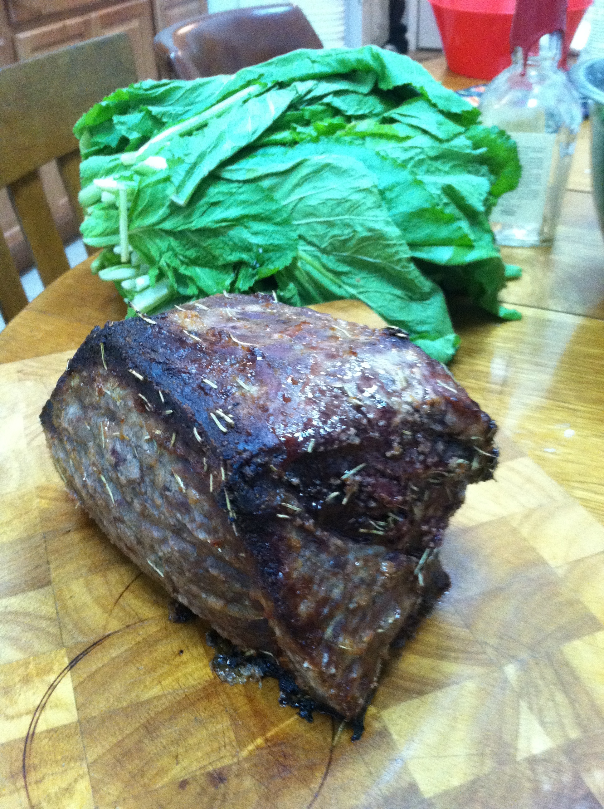 Mix together spices and just enough oil to make a thin paste. Rub paste on beef and refrigerate overnight. An hour before cooking, take the beef out of the refrigerator and let it sit at room temperature. Preheat oven to 325 degrees. Scrape off most of the paste before placing beef in oven. Cook until the internal temperature is 130 degrees or about an hour and a half. Allow meat to rest for 10 minutes before cutting. Serve with chile rellenos and mustard greens. Enjoy.