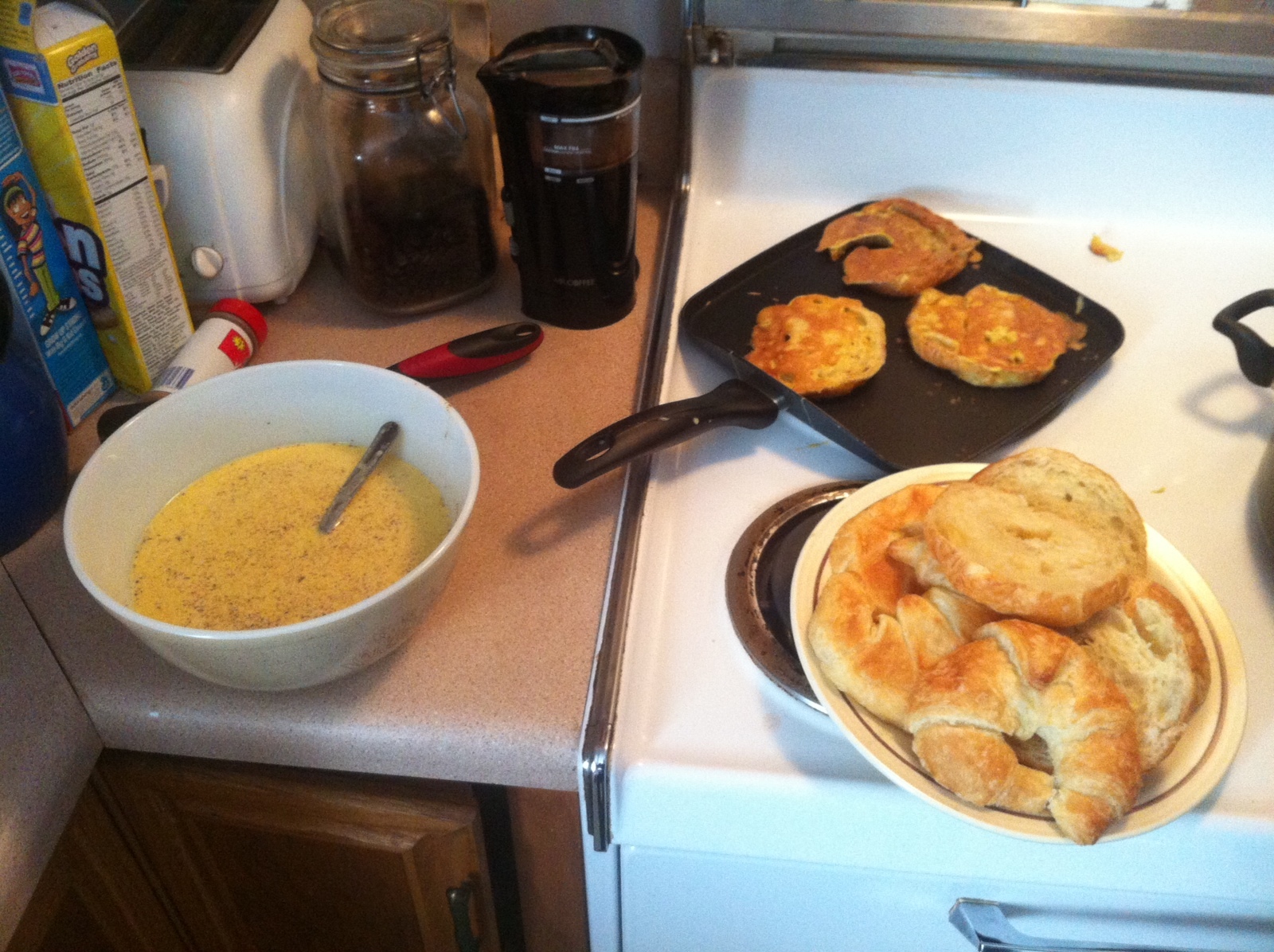 Cut croissants in half, dip into egg mixture for 5 seconds and pan fry for 2 minutes on each side. Move croissants into preheated oven and cook for 15 minutes or until custard is set. Sprinkle with powdered sugar, serve with bacon and enjoy.