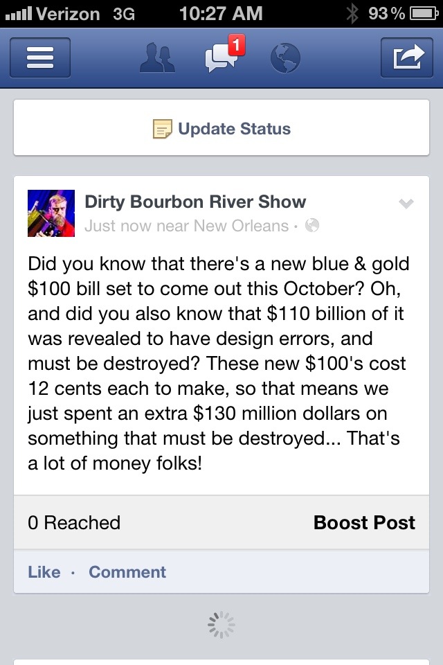 The New $100 Bill: A $130 Million Printing Error 07/26/2013 by dirtybourbonrivershow · General Share this: Click to share on Facebook (Opens in new window) Facebook Click to share on X (Opens in new window) X Click to share on Tumblr (Opens in new window) Tumblr Like Loading... Related $100 bill engraving error FEB hundred money monopoly « Prev Next » Leave A Comment ↓ Comments Leave a comment Cancel reply Δ Trackbacks & Pingbacks No incoming links found yet.