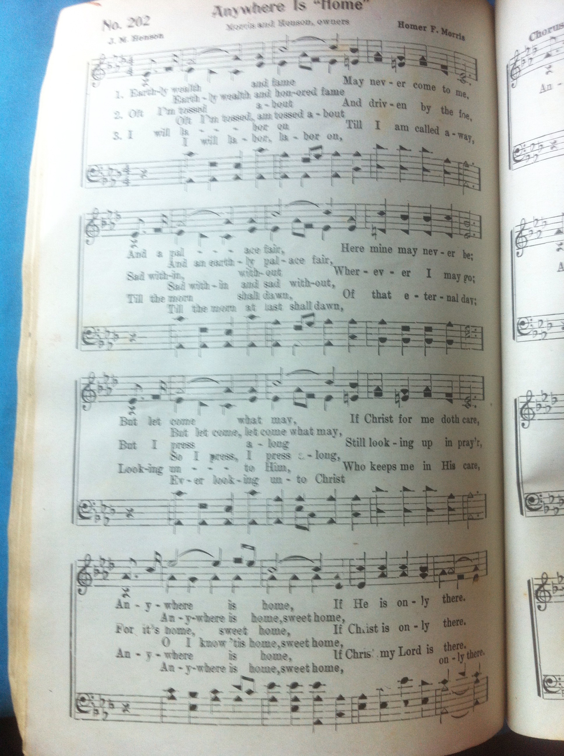 Touring is lots of driving, y’all. Lots of sitting, and lots of passing time. One of my favorite ways to spend some van hours has to be (dorktastically enough) mental sight singing, and the throwback Shapenote gospel hymnals have some good old time tunes to keep the brain sharp on a long drive. Here’s one that jumped out at me just earlier – it’s an appropriate title for travelers like ourselves. Take a glance at “Anywhere is Home”: