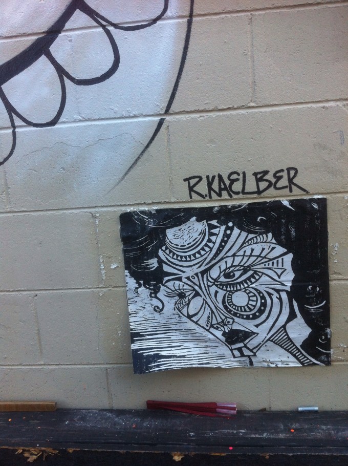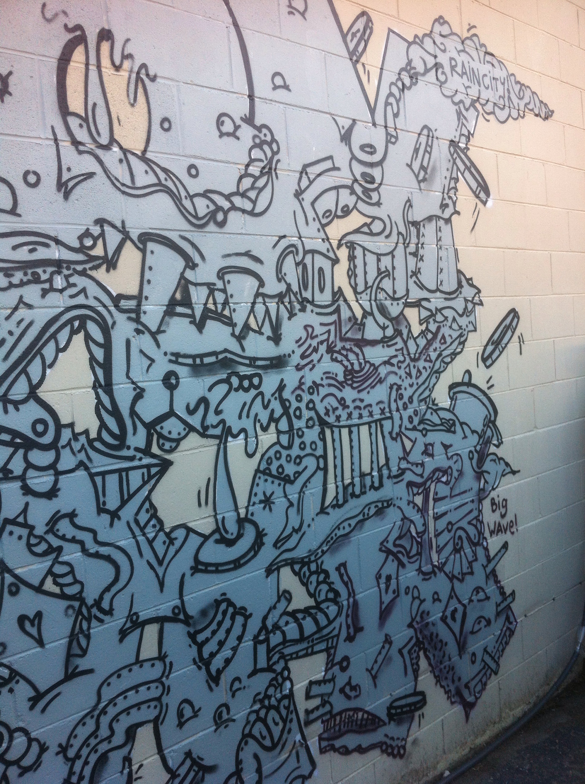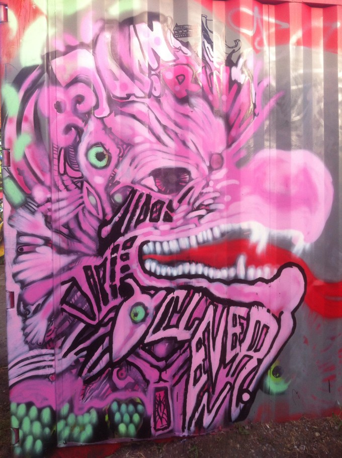 As the van pulled into the little driveway behind last night’s venue here in Richmond, Virginia, my eyes caught sight of one of my favorite back alley phenomenons – a street art gallery. I spoke briefly with the man who owned the restaurant next door after he’d joined us in the alley to work on one of his own pieces. I asked a bit about the artwork and learned that in addition to his rad pink bird-creature creation, the alley also was rocking a killer fish painting done by his two sons, ages 4 and 2, respectively. I was very impressed by all of their work, as well as the other anonymous creations dotting the corridor. If you were to walk down that alley today, you might see something sorta like this: