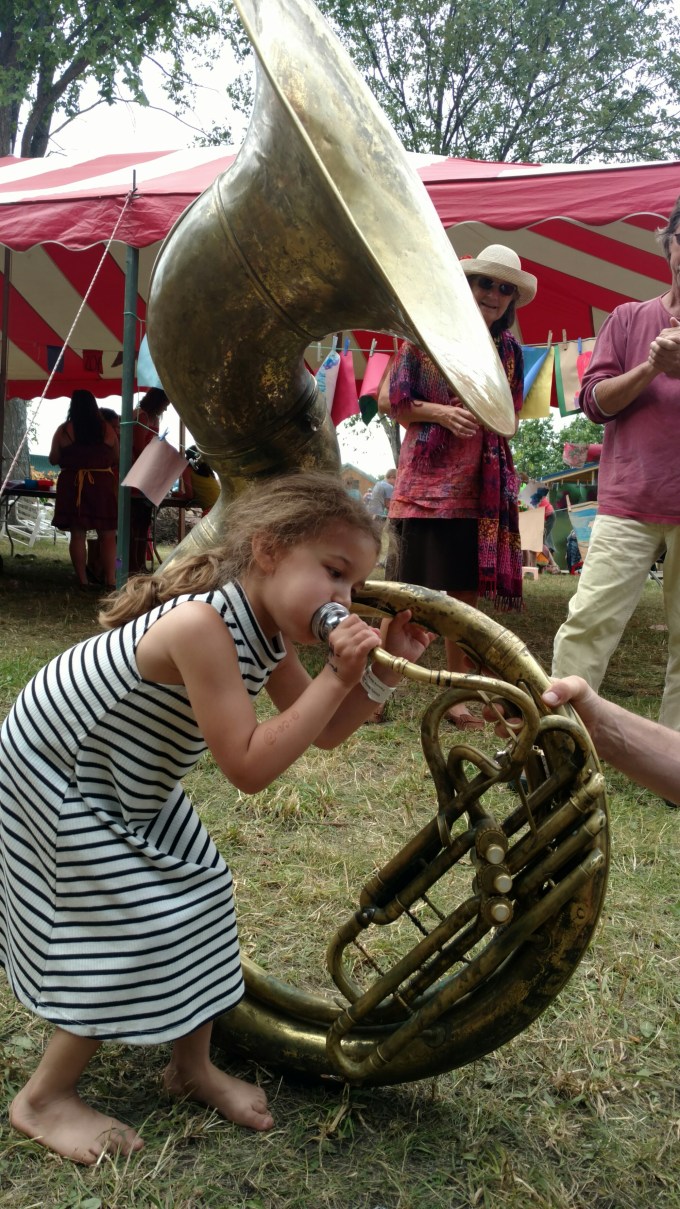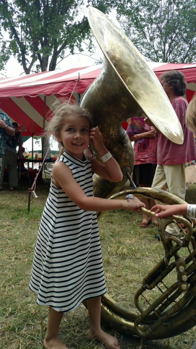 We got a real special one today, my absolute favorite so far. After our second set at Blissfest, we were charged with heading the Children’s 2nd Line Parade. Right before we were supposed to start, a little badass came up to me and told me she wanted to play my horn. I was excited to see what she could do and she did not disappoint. She has some mighty lungs in that tiny frame. Without further ado, it is my utmost pleasure to introduce to you, the most adorable dancer/ukulele player/budding tubist, Zoë!