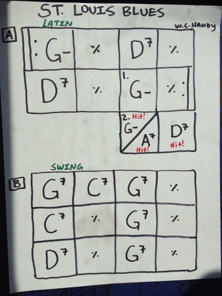 It’s a pretty simple song, with just an A section and a B section, the B section being your typical 12 bar blues changes. So why all the fuss? The answer lies in two key components – a Latin time feel in the A section, and a parallel key modulation between A and B.