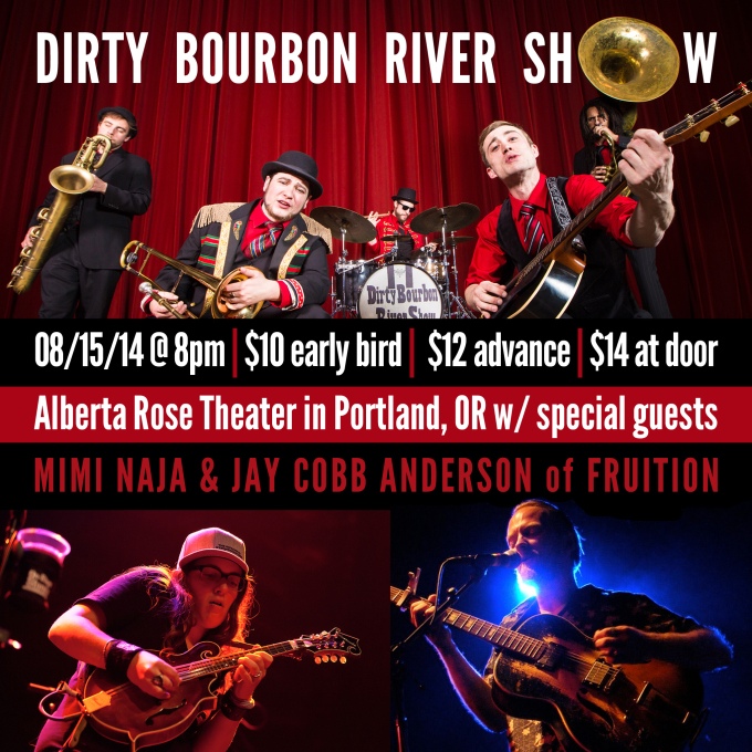 Today we make our Portland, Oregon debut and we couldn’t be happier to share the stage with our longtime friends, Portland natives, and phenomenal musicians, Jay Cobb Anderson and Mimi Naja from Fruition! Come out to the Alberta Rose Theater for a night of fine pickin’, singin’, and lots of brass. Mimi and Jay will start off the night at 9, Dirty Bourbon kicks off at 10.