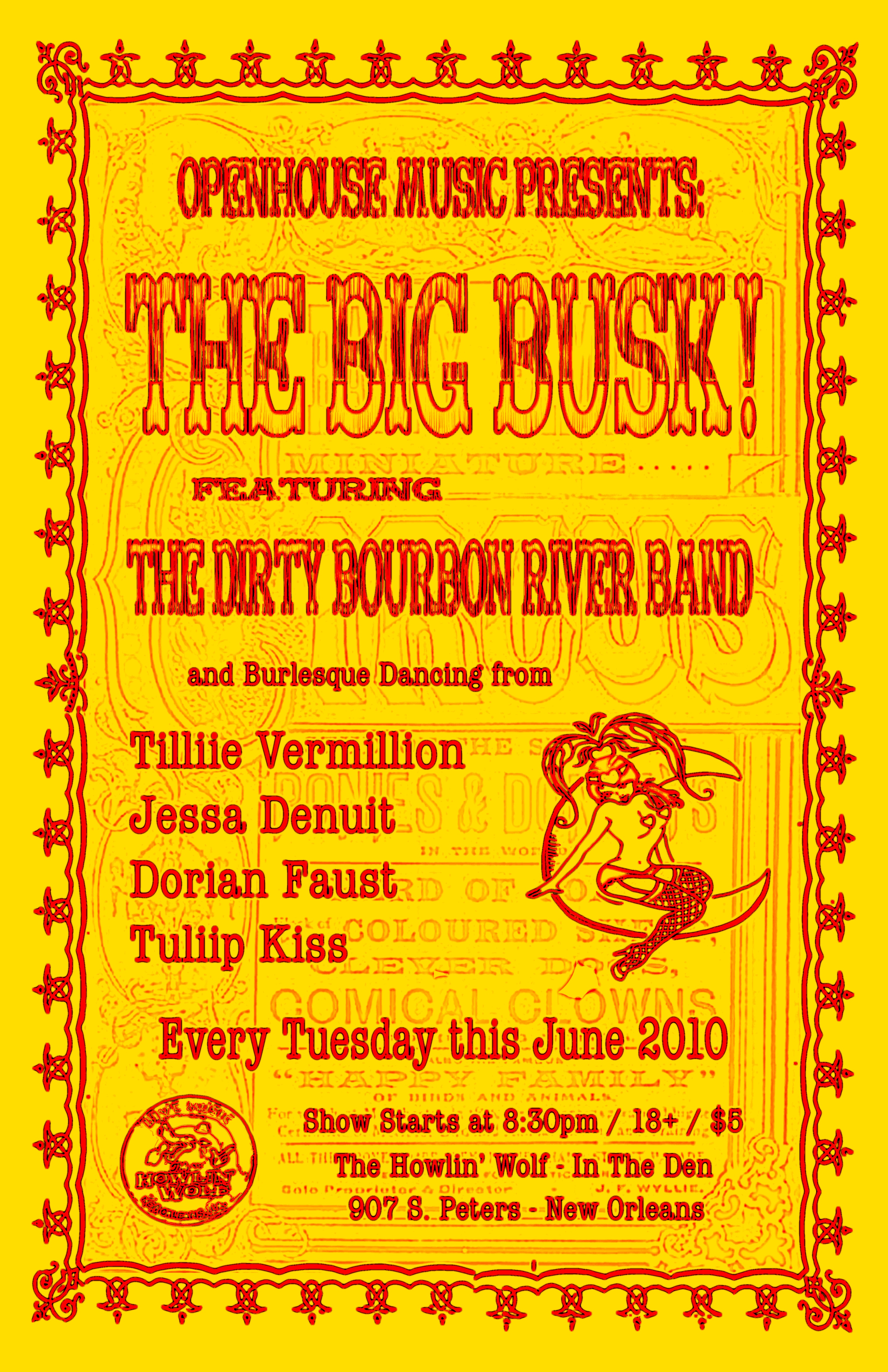 Tonight (June 1st) and every Tuesday this month, the Dirty Bourbon River Show will be featured in TheBigBusk!, a weekly live music burlesque and vaudeville hour at the Howlin' Wolf on 907 S. Peters in the Den.